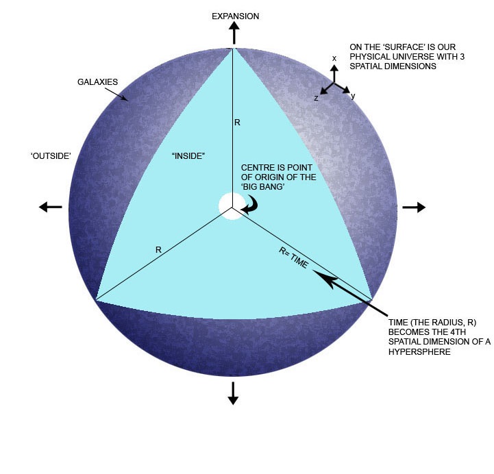 size of the physical universe is unbelievably vast. The ratio of the volume of a sphere to its surface area is enormous and this would also apply to a hypersphere. So there would be no shortage of space in the place where we may all eventually find ourselves. The expansion within a volume is rather like observing raisins moving further apart in a rising cake. And cosmologists use this analogy when viewing galaxies in our expanding universe on a cosmic scale. But our 3D universe is only the “skin” on a 4D sphere. With the consequences of an extra spatial dimension we must consider this process on different scale. So experiencing the expansion of space within a large expanding balloon is very different from the perspective of being at its surface. In other words the increasing radius (or time) of the sphere is hardly perceived from inside the sphere, only at its surface. “Our” time becomes their time spatial dimension.