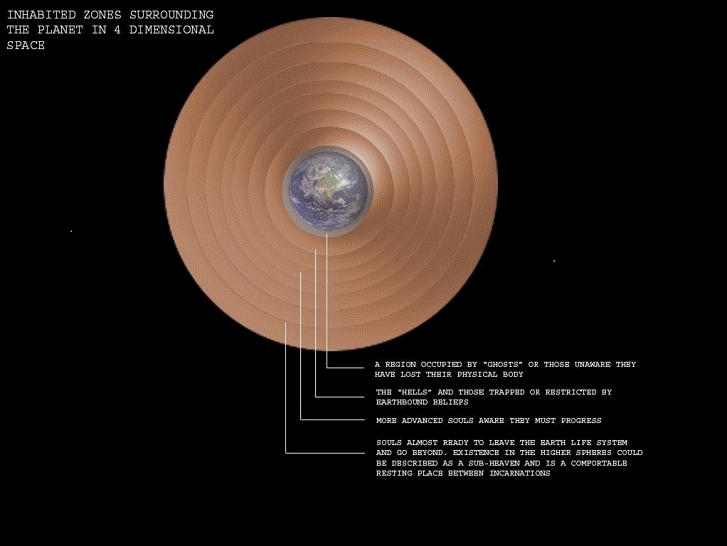 I would maintain here that these regions are spheres surrounding our planet but not in normal physical space and time. Also information that comes through from people working as mediums report that the sun, moon and stars are not visible in the afterlife, which should be expected in this situation. For example, traveling say, half way to the moon and looking for these zones will not work. These inhabited spheres are located in 4 dimensional space/time and require a direction of travel we do not have access to with a physical body. Traveling outwards from the Earth in all directions through the spheres will lead to the centre of the universe in 4D space. Munroe felt that he was somehow becoming out of phase with his physical body during OoB travel but he also found that he could travel in a direction not describable in physical space/time. The spheres surrounding our planet in 4D space are represented in the diagram below. Obviously it is difficult to show 4D space on 2D page.
